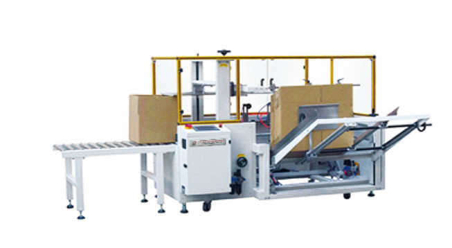 ★自動完成開箱、成形、下底折葉折曲.并現(xiàn)時完成下部分膠帶粘貼,將疊成紙板的箱板 自動打開,箱子底部按一定程序折合,并用膠帶密封后輸送給裝箱機的專用設備。